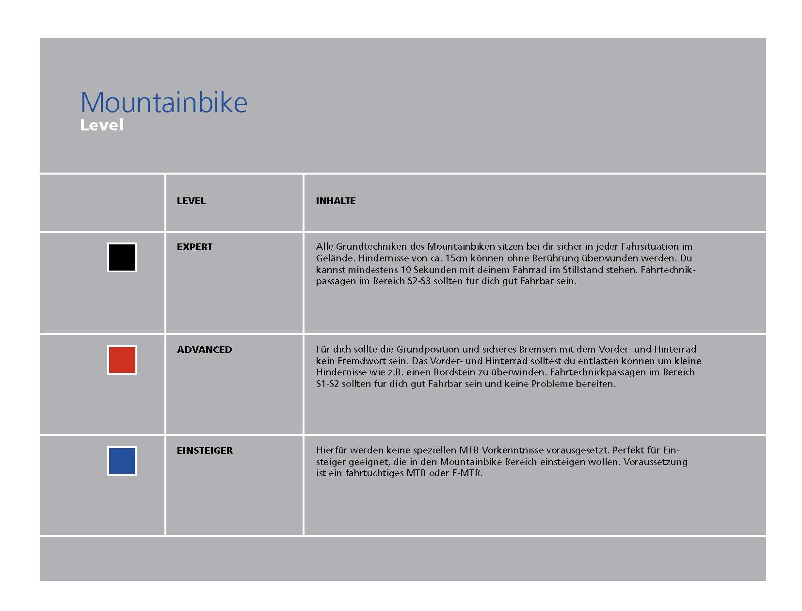 Damit unsere Kurse zum Erfolg werden und allen Teilnehmern gleichermaßen Freude bereiten, sind harmonische Gruppen unerlässlich. Hierbei sollten alle Mountainbiker möglichst den selben Wissensstand und Fähigkeiten haben.